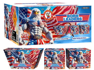 WOW! The best R,W,B 3-PC W angled compound cakes. Shoot these three 36 shots cakes together for a 108-shot backyard show. Red/white/blue tail up to white strobe with red/blue. Visual delight!